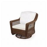 Spring Haven Brown All-Weather Wicker Patio Swivel Rocker Chair. Relax in comfort and style with the Spring Haven Brown Wicker Patio Swivel Rocking Chair from Hampton Bay. It's great for your porch, patio or sunroom, as it combines a sturdy rust-resistant steel frame with all-weather resin for seasons of outdoor use. It comes with sky blue woven olefin cushions for your back and seat. The color of the cushions complements the multi-tone brown wicker finish for an elegant blend of color that enhances a variety of decor styles. *CUSHIO COLOR UNKNOWN*-PLEASE PREVIEW*NEW! In retail package. Retails for $356.45. <76> |