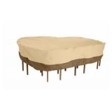 Classic Accessories Veranda Oval/Rectangular Patio Table & Chair Set Cover - Durable and Water Resistant Outdoor Furniture Cover, Pebble, Large, up to 108 Inches Long (70932). Protect your outdoor patio set from the sun, wind and rain with the Veranda Patio Table & Chair Set Cover. The fabric top fits elegantly around rectangular or oval tables and 6 standard patio set chairs. This patio furniture cover features a protective water-repellent and resistant PVC undercoating, and a protective dark splash guard skirt. Covered mesh air vents reduce inside condensation and wind lofting, so the patio table and chair set cover won't fly away. Click-close straps snap over table and chair legs to secure the cover. An elastic hem cord with toggle allows adjustment for a secure and custom fit, and you can easily remove the patio furniture cover with convenient padded handles. NEW! In opened retail package. Retails for $103.99. |