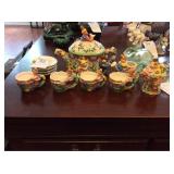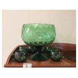 This online auction features vintage Green Italian hand blown glass punch bowl and cups; oak 3-tier folding table. Original art. GLASS/CRYSTAL/CUT GLASS/ART GLASS: Vintage Whitehall Indiana green cube glass tray with handle and glassware; gold-painted overlay green decanter and glasses; pinwheel; vintage Fenton; vintage Indiana black diamond point urn; Wedgwood. CHINA/STONEWARE: Vintage China Pearl "Paradise" 8 piece place settings 1941 Gaston pedal car bank/1997; 1982 autographed baseball/Toronto Bluejays; Large collection Blue Mountain Pottery; stamps; plates and much more!
