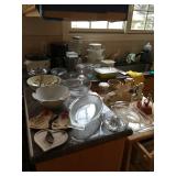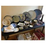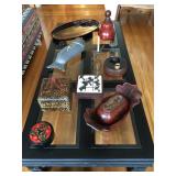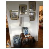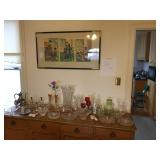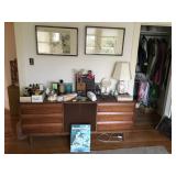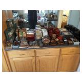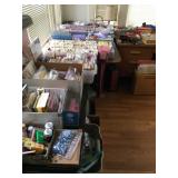 Antique Japanese Hibachis, Geisha dolls, porcelain Hakata dolls, Tabako-Bon Japanese tea ceremony smoking set, 3 tiered wood lacquer box, Chinese pewter fish tureen, Japanese screen by Shoraku Sanjin, Japanese screen with sailing vessel, Japanese triptych by Kunisada Utagawa c.1865, antique Japanese wedding box, Japanese black lacquer tray with 3 monkeys, Chinese dragon lantern, Japanese large brass alter candlesticks, Japanese mother of pearl inlay curio cabinet, Japanese watercolors on silk, Lars Norrman lithograph, Feng Runvhi Chinese painting of donkey, Benjamin D. Kopman small oil painting, G.H. Boughton oil painting of a girl, Jo Polseno oil painting of spoonbills over lake, Samuel Lang oil painting, Aboriginal paintings on bark from Cairns, Australia, contemporary art pieces, pair of Asian square ginger jars ( one made into a lamp), 4 Kesi Chinese woven silk framed textiles. Cloisonné pieces, Sterling silver pieces, fine jewelry, jade bangles and costume jewelry, Malcolm Moran small bronze sculpture, Beatrix Potter Wedgewood child's sets, cut glass and crystal pieces, Japanese plates, dishes and platters, pewter pieces and a piece of Baccarat, large copper (plant) pots. Walnut Mid Century media cabinet, Mid Century dresser/credenza, large oak teachers desk, nice dining table, buffet and china cabinet, cart with folding card table, mission style sofa, Japanese table with glass panels. Sansuii tuner, cassette deck and amplifier, Sanyo turnable, Marantz Speakers, box of records (mostly Japanese), loads of books - children's and cookbooks galore, pamphlets and magazines, loads of maps, comic books. Kitchen full of Pyrex, Corning ware, nice Japanese style dishes, 100's of candy/chocolate molds, cookie cutters, baking supplies, cookies sheets, baking pans and molds. Craft room full of card making supplies - 100's of rubber stamps, punch cutters, handmade papers, note card supplies, paints, glitter, pens and much much more. Lots of Christmas (AnnaLee collection), Halloween (including costumes) and Easter. Beanies and Disney plush toys. 2 closet of clothing and shoes - men's and women's. Some vintage dresses and other pieces. Closet full of linens, some sewing and loads of ribbons. Dolls and doll clothing, doll crib and high chair, 3 Barbies and Barbie clothes, one Tonka truck, one Borden milk truck, Gum ball machine, die cast cars and trucks, Hot Wheel tracks, a few train pieces. Garage is packed with vintage games and toys, vintage school items, craft items, loads more books, country style kitchen table and dresser, lots of luggage and travel bags, camping equipment, vintage light fixtures, some tools and lumber,United travel posters, tons more Holiday and so much more to mention - this place is packed.