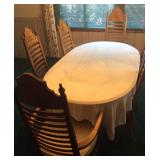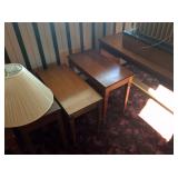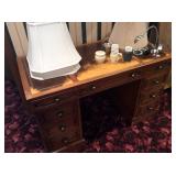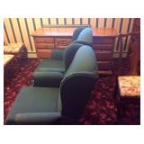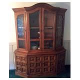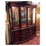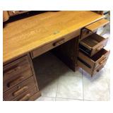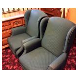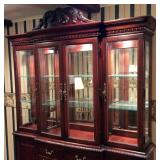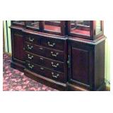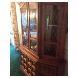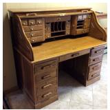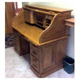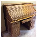 FURNITURE Roll top desk and caster base chair. China buffet and dining table set with 4 high back chairs. Huge Thomasville breakfront with beveled glass doors, glass shelves above, and drawers and cabinet storage below. Mahogany finish. Sofa console tables, end table, accent tables. Maple crendena/dresser with matching end table. Wing back chairs, numerous traditional high back dining type chairs, assorted wood chairs. Swivel barstools with cushioned seats. Wood tall bookcases, several new or lightly used piano benches. Double pedestal desk with leather inlay top. Folding chairs and other furniture too numerous to mention.