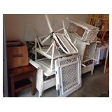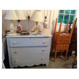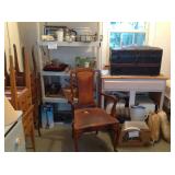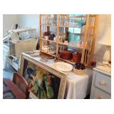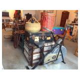 Garage sale items including antique butter churn, framed artwork, kitchen island, AC unit, small dresser, end tables, vintage chest, kitchenware, microwave, electronics, mirrors, lamps, china and glassware, glass top dining table with 4 chairs, custom jewelry, wicker furniture, records, exercise bike, basket collection, toys and games,, books, piano stool and more!