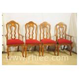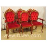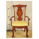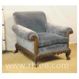 Heavily carved arm chair with blue upholstery; 55-2753 - (finish and fabric as-is; front skirt may have been cut off) - 38x41x34