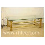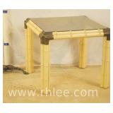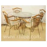 Iron and rattan 5 piece dining set; 737-1215 - round glass top table 42x42x30 - 4 open arm chairs (fabric is dirty) 22x21x35