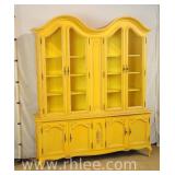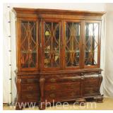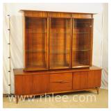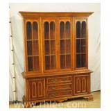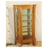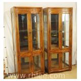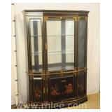 Pair of Drexel serpentine front lighted curio cabinets; 55-2674 - mirrored back with adjustable glass shelves - curved glass - (missing 1 pull and 1 shelf) - 32x20x79.5