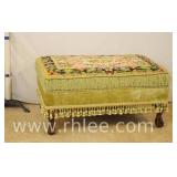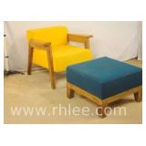 Oak open arm chair with ottoman; 55-2643 - yellow fabric on chair, blue on ottoman - (fabric dirty/stained on both) - 31x31.5x26 chair; 24.5x24.5x15.5 ottoman
