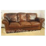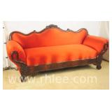 Carved crotch mahogany sofa with red upholstery; 74-3310 - serpentine front - (1 arm has cracked neck) - 79.5x32x37