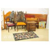 Group of misc furniture; 55-2019,1211,1403,279,2651, 2026,2105,2444,2683 - 3 headboards, 2 chairs, night stand, needlepoint print, 2 mirrors, stool, etc. - (all as-is)