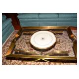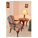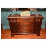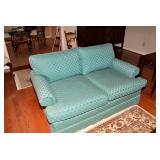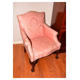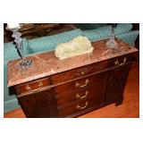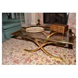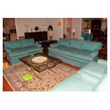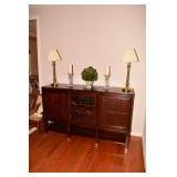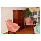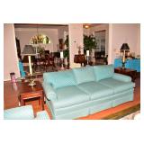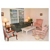 Living Room: Sofa with Matching Loveseat and 2 Upholstered Chairs, Armoire, Mable Top Console Table, Pair of Upholstered Chippendale Style Chairs, Arm Chair, Modern Sideboard/Console, Pair of Antique Style Wood Tables, Brass and Glass Modern Coffee Table, Art, Smalls, Accessories, Lamps, Child’s Rocking Chair, Candle Stand Table, Rug, Faux Tree, and More.