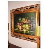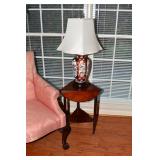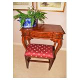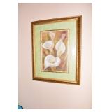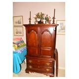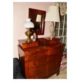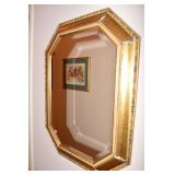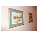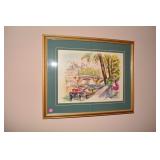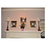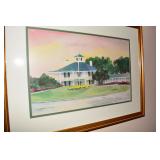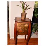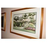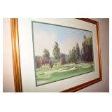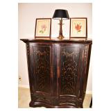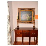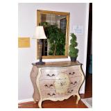 Foyer/Hallway: Painted Bombe Chest, Mirror, Lamp, Faux Tree, Art, Small Painted Side Table, Masters Golf Watercolor Paintings, and More.