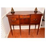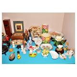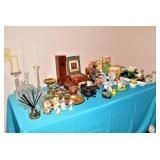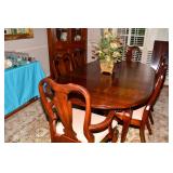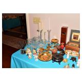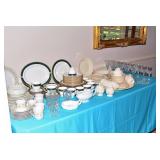 Dining Room: Mahogany Dining Room Table and Chairs, Antique Style Corner Cabinet, Modern Console Table, Oil Painting, Gold Trimmed Mirror, Rug, Lenox China, Wedgewood China, Royal Doulton, Glassware, Waterford Crystal, White Milk Glass, Smalls, Occupied Japan Figurines, and More.