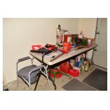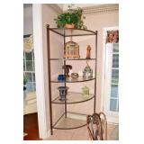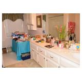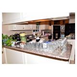 Kitchen: Glass and Iron Kitchen Table and Chairs, Marble Style Pedestal, Iron and Glass Corner Shelving Unit, Small Antique Chair, Pots and Pans, Dishes, Crockpot, Glassware, Bakeware, Flatware, Tupperware, Serving Dishes, Pyrex, Cups, Mugs, and Much More.