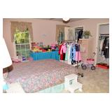 Bedrooms: King Size Bed with MCM Headboard, Mattress, Linens, Armoire/Wardrobe, Pair of Upholstered Stools, Pair of Side Tables, Vanity Table with Stool, Art, Women’s Clothing (Older, Size M-L, Shoe Size 9.5-10), Antique Full Size Bed (Converted Rope Bed), Antique Dresser, Mable Top Antique Side Table, Luggage, Christmas Décor, Newer Women’s Clothing Boutique Clothing (Size S (4), Shoe Size 9), Girl’s Clothing and Shoes, Toys, Games, Electronics, Wicker Lingerie Chest, Wicker Dresser with Mirror, Wicker Nightstands, Brass Bed, Draperies, Antique Full Size Quilt, Armoire, Office Chairs, Lamps, Bathroom Accessories, Walkers, Bath Towels, Wicker Side Tables, and More.