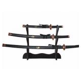 Renegade Tactical Steel Scorpion Samurai Swords Set of 3 Scorpion Samurai 3 sword set includes Katana, Tanto and Wakizashi swords, from 9-1/2"L to 27"L. Cord-wrapped hilts, copper detailed menuki and tsuba. Sheaths have gold scorpion designs. Carbon steel blades. Includes wood stand. This item may be prohibited for sale in some areas. Laws regarding the ownership, carry and use of these products vary from one community to another. NEW! In plain box. Retail:$69.99. |