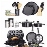 alcove 70-Pc. Kitchen in a Box 10-pc. nonstick aluminum cookware set includes 8" and 10" fry pans, 1-qt. and 2-qt. covered saucepans, 2-1/2-qt. covered sauté pan, and 5-qt. covered Dutch oven 10-pc. bakeware set 7-pc. cutlery set with wood block and cutting board 6 nylon tools and 2 wooden tools with ceramic crock 4-pc. metal skewers set 6-pc. borosilicate glass food storage set with lids 4-pc. stainless steel canister set 5-pc. measuring spoon set 5-pc. measuring cup set Salt and pepper set in wire rack Silicone brush and spatula Stainless steel egg whisk Plastic ice cream scoop, can opener and peelerNEW! In factory box. Retail:$199.99. |