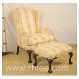 Isenhour wing back arm chair with matching ottoman; 37-484 - ball in claw feet - shell carved knees - (small stains on seat) - 30x33x44 chair; 27x20x16