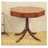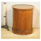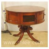 Round inlaid mahogany drum table with pedestal base; 68-520 - brass toe caps - 4 wire doors - (deep scratch on top) - 34x34x28.5