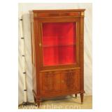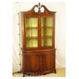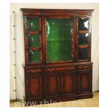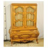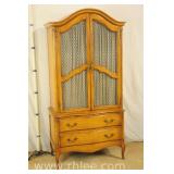 Green carved French style cabinet with lighted interior; 737-1255 - 2 wire door over 2 raised panel doors - adjustable glass shelves - (missing pull) - 39x17x83.5
