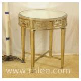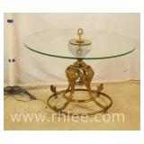 Ornate metal side table with round glass top; 68-447 - lighted base - (chips in edge of glass) - 32x32x25