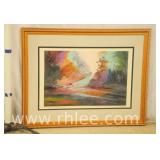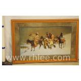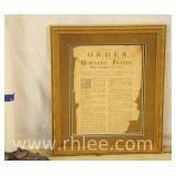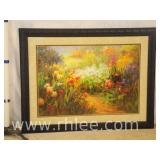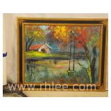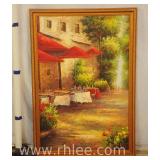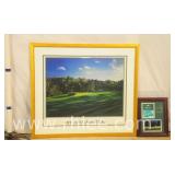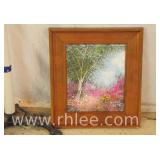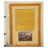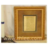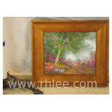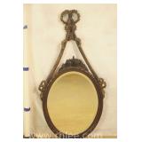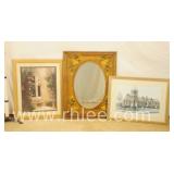 Decorative framed mirror and 2 prints; 813-121,122,124 - oval mirror with decorated rectangular frame 28x36 - print of church 31x23.5 - print of church garden bench 25x32