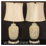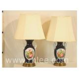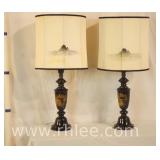 Pair of Oriental decorated black and gold metal lamps; 737-1258 - (shades as-is) - 16x16x35