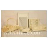 Group of 6 small white wicker pieces; 812-122 - basket, mirror, tray, shelf, etc.