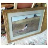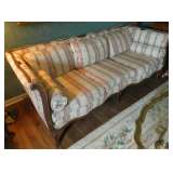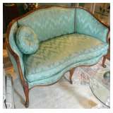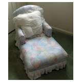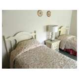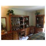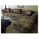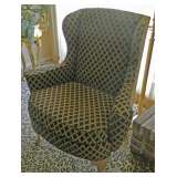 FURNITURE: Beautiful upholstered settee. Upholstered Italian sofa. End tables. 2 Gorgeous gold and white decorative chairs. Lovely sectional sofa with two large ottomans. 2 Upholstered recliners. Like-new white crib, changing table and dresser. Twin Beds with matching dresser/bookshelf, writing desk. Maple bedroom set with great wall units and mirror, end tables, chair and fabulous bedding with drapery to match. Two lush blue chairs. Upholstered lounging sofa. Patterned glass designer coffee table. Asian 3 piece wall/display cabinet. Brass and glass small tea table. High chair.