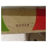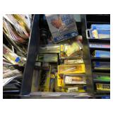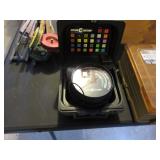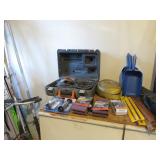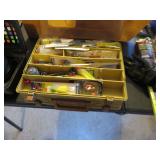 A water clarity meter, ice fishing equipment and a big tackle box full of lures.