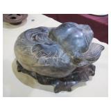 Rare Carl Christiansen 11” Westslope Cutthroat fish decoy; one of a kind Carl Christiansen wind chime w/String Ray, Painted Turtle & Quillback carvings; Carl Christiansen pine accent table w/Woodpecker & Song Birds; Carl Christiansen CC and other fish decoys; 1st Model Orvis glass minnow trap; Norlunds Fish Grabber; James Purdy gun cleaning kit; ON-80 rifle scope; large forged Bear trap; 8pt deer mount; Shaw & Tenny leather wrapped spruce boat oars;