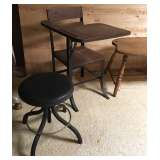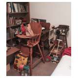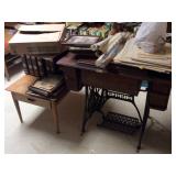 ANTIQUES Side chairs, school tablet desk with metal base, high chairs Singer treadle sewing machine, matched set of 6 oak dining chairs with caned seats Assorted glassware, miscellaneous items too numerous to mention.