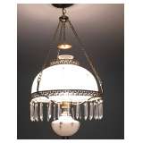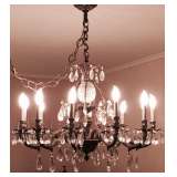 LIGHTING 1 very large brass chandelier with cut crystal section and dozens of large crystal drops 1 vintage chandelier with hand painted milk glass shade, lead crystal fringe