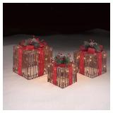 Grapevine Gift Boxes Set Of 3 Outdoor Christmas Decor Make a statement this holiday season with these three gift boxes decoration. Covered in weather-resistant grapevine matirial, these gift boxes can be displayed indoor or outdoors and will last year after year. Each set comes pre-lit with 100 incandescent lights. Item in previously opened retail package. Was plugged in lights work but was not taken out of box to make sure all pieces were there. Please come and see at the preview. Retail: $79.99 (133) |