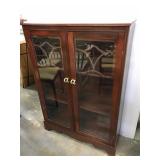 147 Bookcase Vintage mahogany bookcase with glass doors. 46 inches tall by 33 inches wide by 11 inches deep.