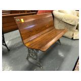105 Oak bench Oak park bench cast-iron base, metal tag with number nine. 32 Tall by 44 inches long by 21 inches deep.