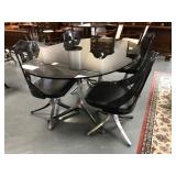 104 Dinette set Dinette table with smoked oval glass and four chairs. Table is 29 inches tall by 67 long by 22 deep.