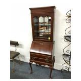 70 Secretary desk Mahogany two-piece secretary desk, very clean, top has mirrored back and glass shelves. 72 inches tall 26 inches wide by 18 inches deep.