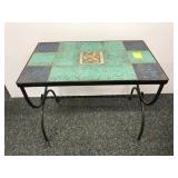 74 Tile top table Tile top table with metal base. 18 inches tall by 21 inches wide by 13 inches deep.