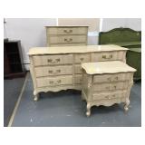 51 3 pcs. Bedroom furniture Three French provincial pieces of bedroom furniture including tall chest triple dresser and side stand. Made by United furniture company.