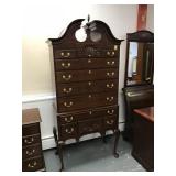 34 High boy One piece cherry high boy, shell carved center drawers, Queen Ann legs, made by Harden furniture company. 84 inches tall by 39 inches wide by 20 inches deep.
