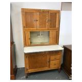 16 Oak Hoosier cabinet OK hoosier cabinet, original porcelain top, refinished oak. 72 inches tall by 43 inches long by 27 inches deep.
