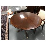 32 Mahogany inlayed table Round mahogany inlay table with glass top, brass feet, casters. 29 inches tall by 44 inches round.