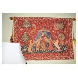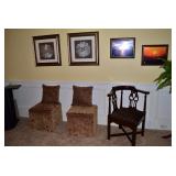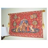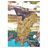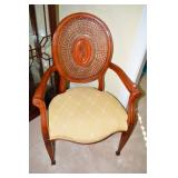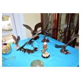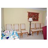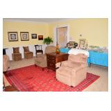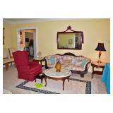 Living Room: Antique Sofa, China Cabinet, Set of 6 Dining Room Chairs, Marble Top Vintage Side Tables, Marble Top Coffee Table, Tapestry, Art, Rug, Lamps, Smalls, Arm Chair, China (Harmony House “Wembley”), Ronald Van Ruyckevelt Bronze Eagles, and More.