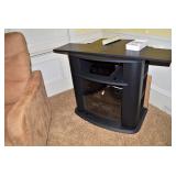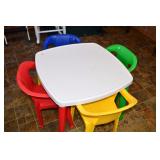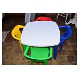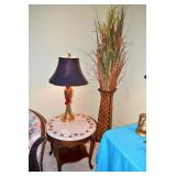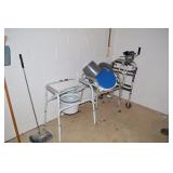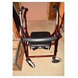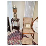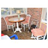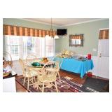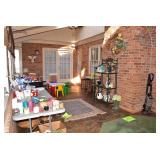 Sunroom: Round Table with 2 Chairs, Marble Top Sewing Table, Vacuum, Rugs, Baker’s Rack, Plant Stand, Kids Table and Chairs, Wheelchair, Rocking Chair, Cleaning Supplies, Smalls, and More.