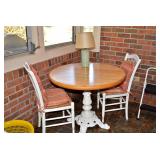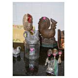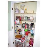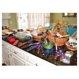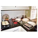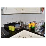 Kitchen:Round Glass Top Table with Pineapple Style Base, Pots and Pans, Bakeware, Small Appliances, Bakeware, Dishes, Glassware, Corningware, Pyrex, Utensils, Knives, Microwave Oven, Toaster Oven, Set of Chicken Cannister Sets, Blender, Food Processor, Crockpot, Art, Rug, Smalls, Mirror, Cookbooks, and More.
