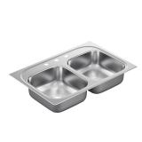 MOEN 2200 Series Drop-in Stainless Steel 33 in. 3-Hole Double Bowl Kitchen Sink Outer dimensions: 33 in. L x 22 in. W x 6-1/2 in. D Sturdy 22-Gauge stainless steel with uniform matte finish APPEARS NEW IN ORIGINAL RETAIL BOX RETAIL $62.55 |