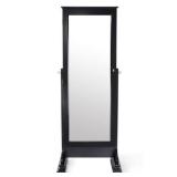 Kathy Ireland San Mateo Mirrored Standing Jewelry Cabinet. Get two furniture pieces in one! Standing, tilting mirror opens up to reveal tons of storage for your jewelry. Simply pick out your accessories for the day, close the door and see how it looks with your outfit. locking mirrored door with key includes necklace hooks, earring slots, ring cushions shelves for storing bracelets, watches, brooches, etc. 23x4x63"H fiberboard with black finish assembly required imported jewelry not included Out of packaging. NO STAND See at preview. Retail price $749.99 |