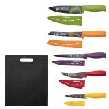 Farberware 11 Piece Resin Knives and Chalkboard Cutting Board Set Black. This Farberware 11-Piece Stick Resistant Cutlery Set feature knives that are perfectly balanced for precision while cutting. Ergonomically designed handles are designed for a comfortable grip. Blade covers protect blade edge and provide safe storage. Cutting board is BPA free and dishwasher safe. Set includes: •6-inch chef knife •6-inch bread knife •5.5-inch serrated utility knife •4-inch cheese knife •3.5-inch paring knife •6- protective blade covers •8-inch x 10-inch black poly cutting board In factory packaging.. See at preview. |