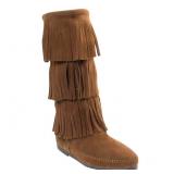 Minnetonka Women’s 3-Tiered Fringed Boot - Dusty Brown - - Size 9. Medium width. Suede upper with 3-tiered fringes. Leather lining. Rubber outsole. Approx. 12" boot height. 13-1/2" calf circumference This item is NEW!! In retail shoe box..
