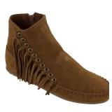 Minnetonka Women’s Willow Ankle Bootie - Brown - Size 6-1/2. Medium width. Suede upper and lining. Rubber outsole. Cushioned insole. Inside zipper closure. 4-1/2" boot height. Flat heel. Metal eyelets. Knotted fringe trim This item is NEW!! In retail shoe box. Retail Price: $65.99 |