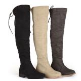 Journee Collection Women's Mount Over the Knee Boot - Gray - Size 8-1/2. Take on the season in chic style with knee-high boots by Journee Collection. These tall boots feature premium imitation suede uppers that rise above the knees and feature a back-tie accent at the top. Wood grain soles and small block heels complete the look. This classic boot is creates a sleek over-the-knee look, while block heels create subtle height and sturdy traction. An inside zipper closure adds subtle design and a simple tie embellishment adds just the right amount of unique detail. Women's tall riding boots. Height: Over-the-knee, Style: Inside-zip, Material: Micro-suede, Toe shape: Round, Heel height/type: 1.2-inch block, Platform height: 0.36-inch platform, Shaft height: 22-inch, Circumference: 15-inch, Width: Medium, Lining: Shaft lined in 100-percent fabric, Sole material: TPR, Footbed: Slightly padded, Upper/outsole material: imitation suede/TPR. This item is NEW!! In retail shoe box. Retail Price: $108.99 |